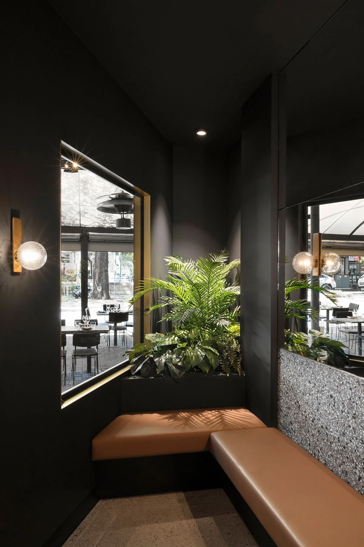 The use of mirror intends to expand the visual length and depth of space creating visual illusion and intrigue within the restaurant. Brass detailing and stunning terrazzo surfaces create an elegant yet playfully dynamic interior that’s paired with a natural concrete wall finish to add an industrious feel. Sculptural handmade glass light fittings waterfalling over fixed booth seating from the high ceiling above to form the weightless experience.